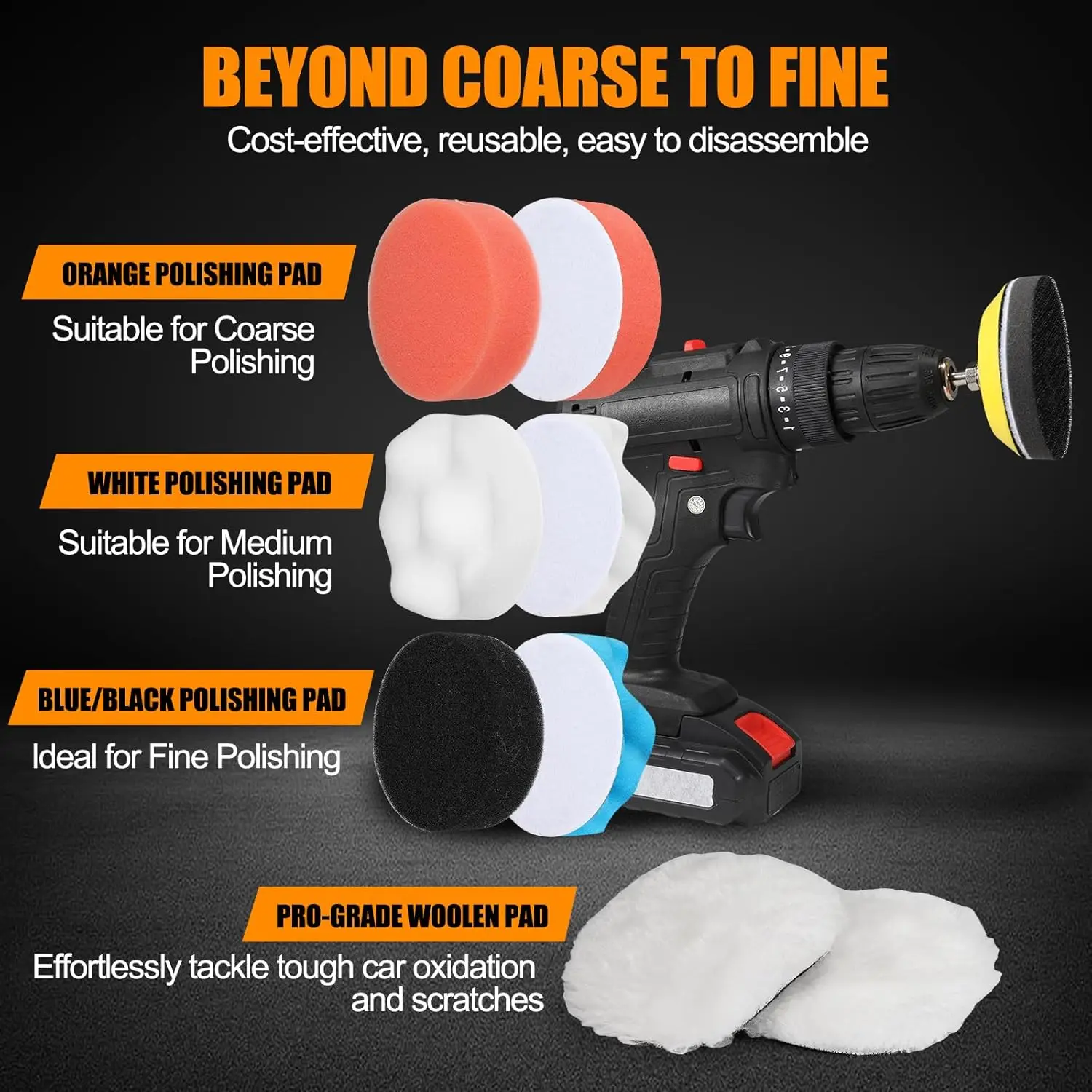 Quality pads:car sanding kit's velcro soft foam buffer pad 2pcs,flat and wave wet sanding pads polishing pads 5pcs, wool polishing pads 2pcs.(Please connect the buffer pad when using sandpaper to increase the elasticity when sanding work and protect the sanding disc for drill), These sponge fine and soft, without damaging the surface. Wool 3 inch polishing pads provide stronger dust cleaning and polishing ability